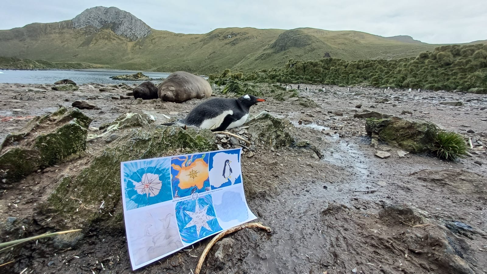 A photograph of the finished flag was taken by Hannah Greetham, a Zoological Field Assistant based on Bird Island, a small research station off the north-west tip of South Georgia in the Southern Atlantic Ocean. Bird Island is separated from the South Georgia mainland by a 500-metre channel, Bird Sound, and lies about 1000 km south-east of the Falkland Islands. The island is home to a small team of researchers who spend up to 18 months studying seals, penguins, and albatross. Their work contributes to long-term monitoring of wildlife populations and climate change impacts, an example of a ‘green career’ appropriate for this week’s national Green Careers Week!