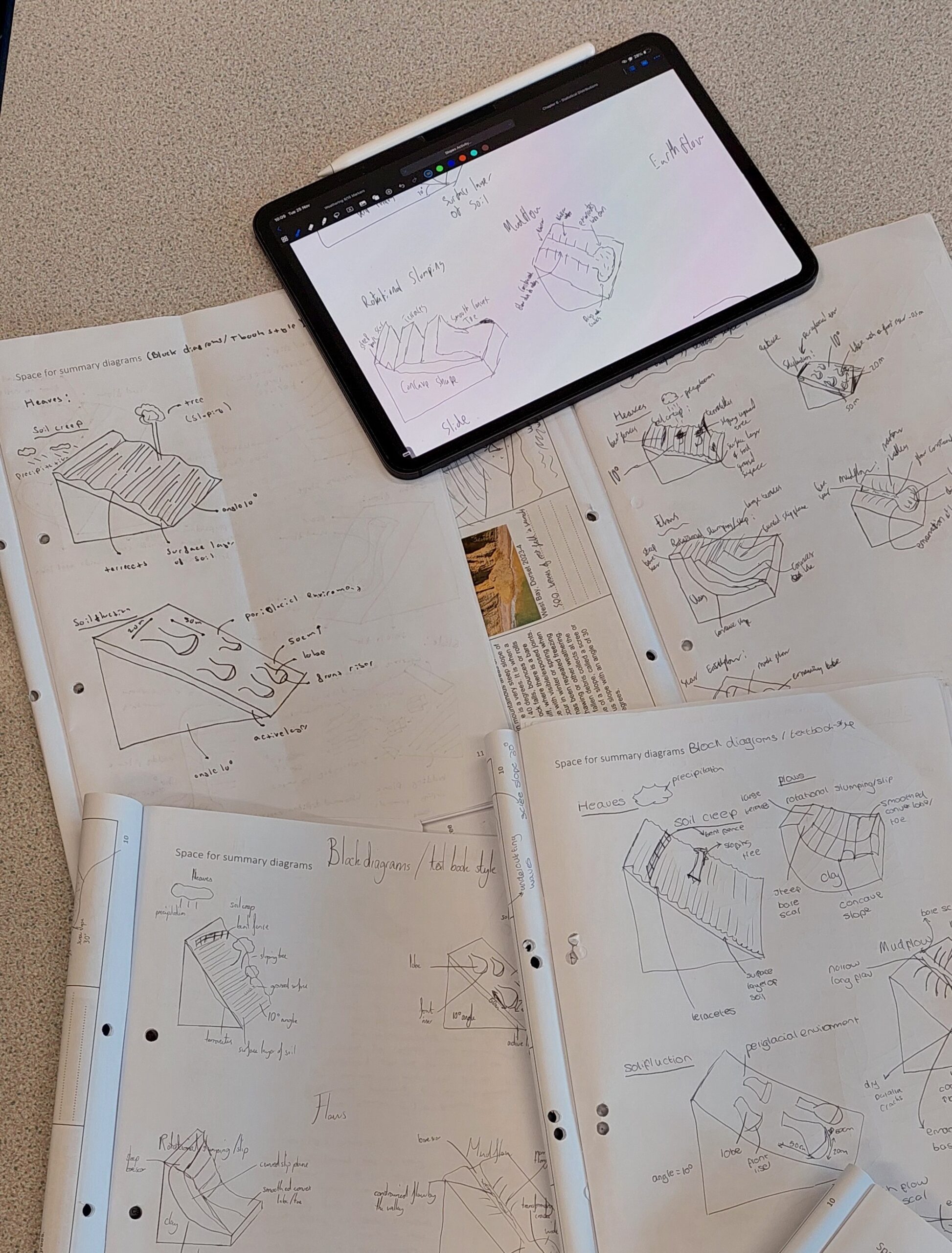 The A Level geographers have been busy consolidating their knowledge and understanding of slope processes this week in their physical geography lessons. Geographers are required to demonstrate a wide range of skills at A Level, including essay writing, analysing graphs and data, and interpreting photographic evidence. They are also expected to draw sketches of sources or produce their own diagrams to explain processes, showcasing their observational and visual skills.
