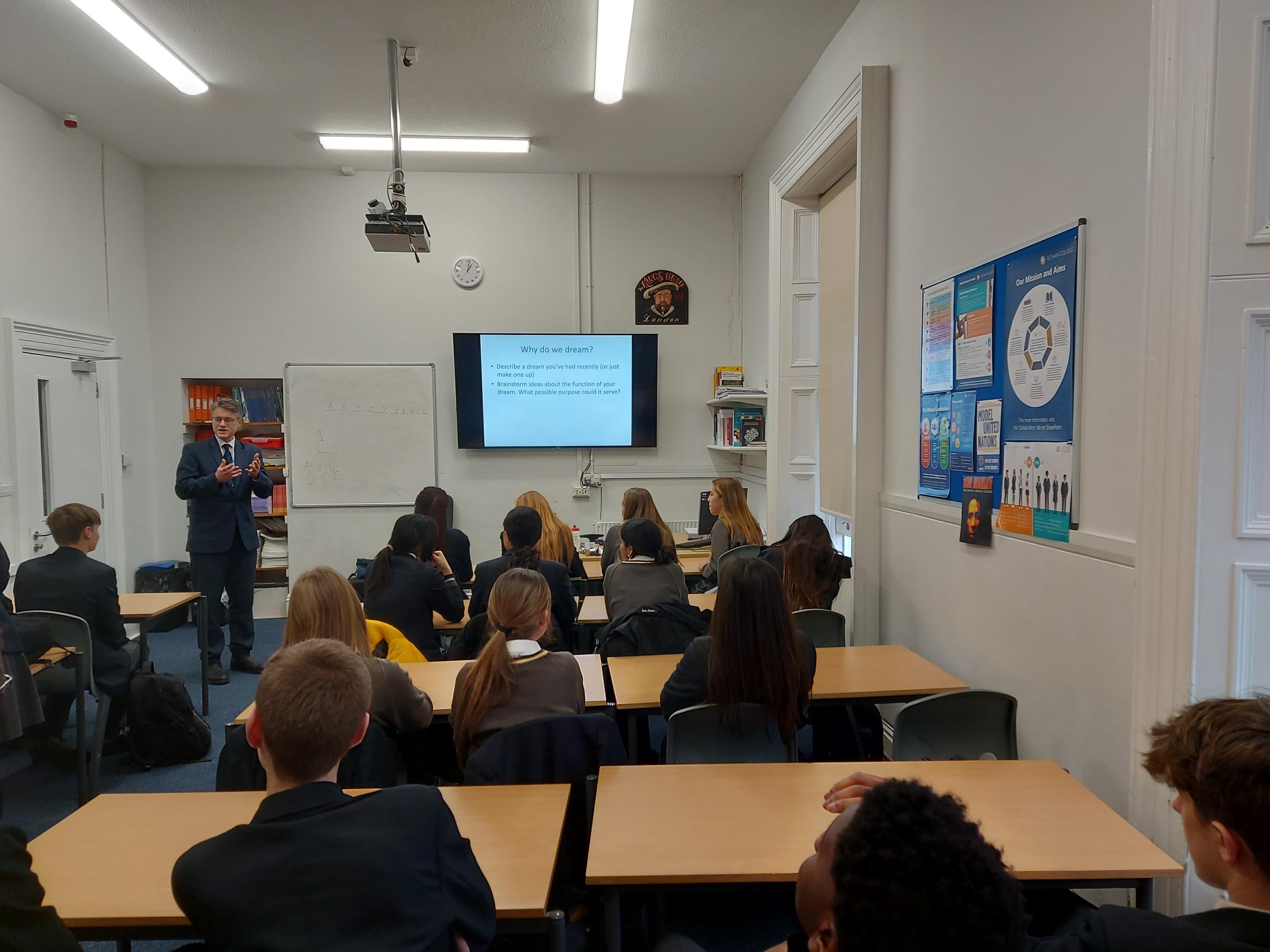 Building on a talk last year about the scientific method, Biology teacher Dr Henry Nicholls gave an overview of several of these alternative hypotheses for the function of dreaming sleep. Given how much time newborn infants spend in dreaming sleep, REM is likely to play an important role in brain development. Recent studies also provide clear evidence of There are several well-known examples of the Eureka-like power of dreams, including August Kekulé’s vision that cracked the structure of benzene, Dimitri Mendeleev’s brilliant periodic table of the elements and Paul McCartney’s Yesterday, one of the most covered songs in the history of recorded music. Dreams might also be the brain’s way of creating a safe, virtual world in which to rehearse dangerous situations.