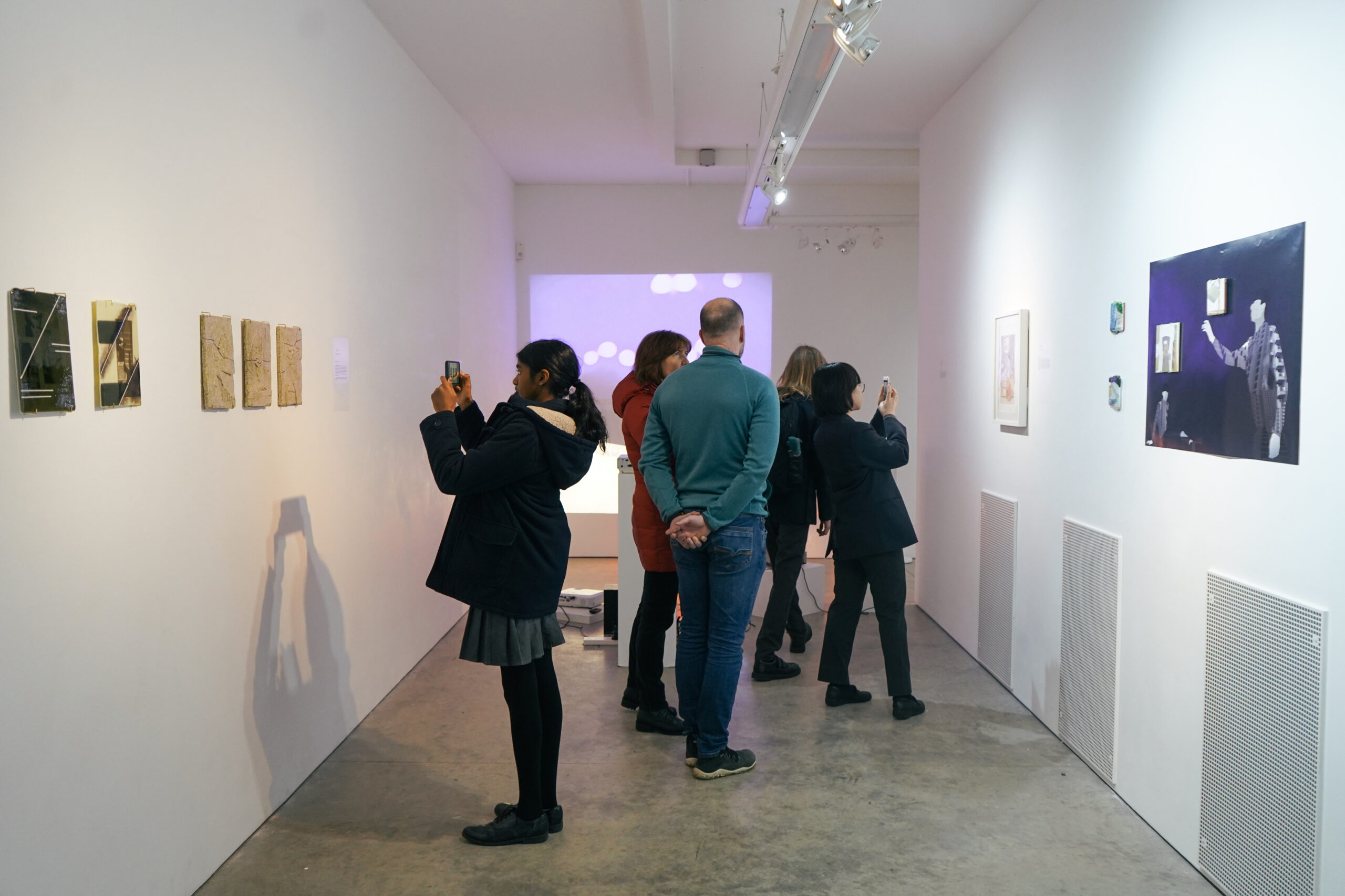 The pieces on show offer distinctive artistic interpretations of the exhibition’s themes, often blending multiple media such as projection, collage and painting.