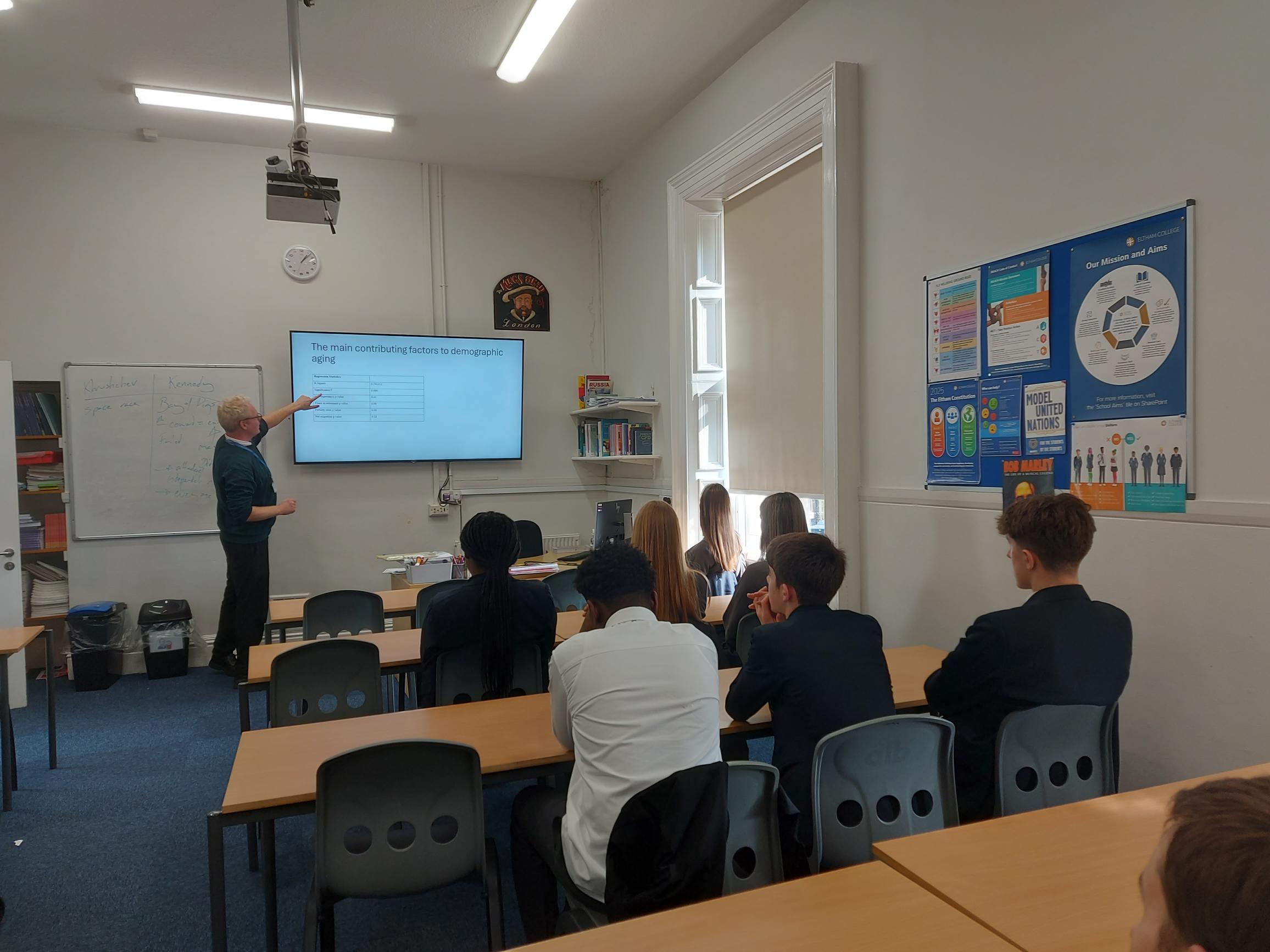 Recently, members of the Year 11 Colloquium attended a lecture by Economics teacher Mr Boulton on the broad issue of demographics and the pressures this places on resources. Utilising some of his own research, he explored the issue of the relationship between changing population, demands on public services and the sources of revenue used to fund these services. He charted the changing balance between these factors, how governments track them and what statistical methods are used to try and gauge the effectiveness of different strategies. He asked the students to think about the viability and acceptability of various options such as a longer working life or the reduction of some benefits. The talk clearly highlighted the issues at stake, the difficult moral and political decisions involved and the use of statistics!
