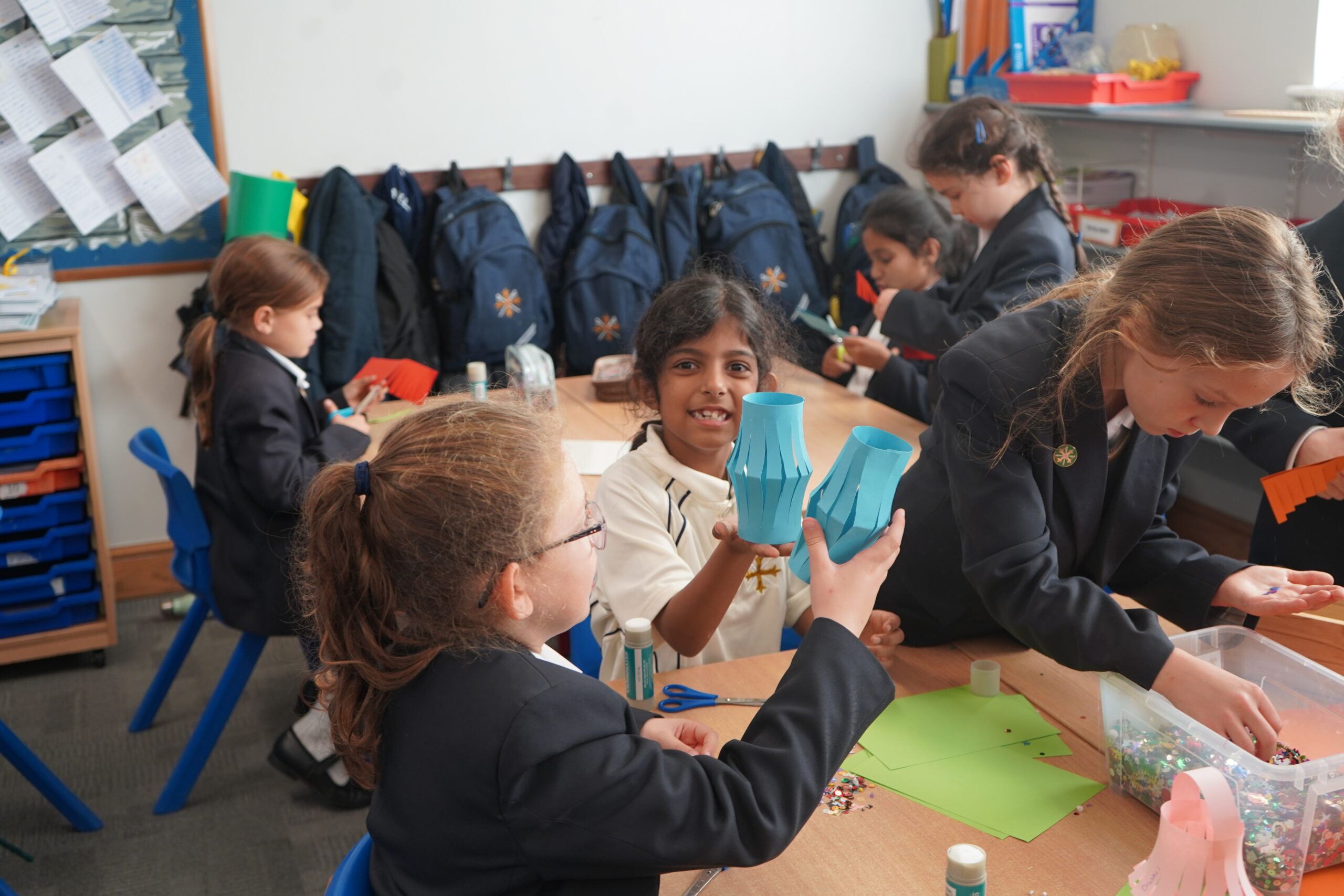 Following the assembly, pupils took part in a hands-on lantern-making workshop, where they crafted their own colourful paper lamps using jewels and brightly coloured paper. The activity encouraged creativity and personal expression.
