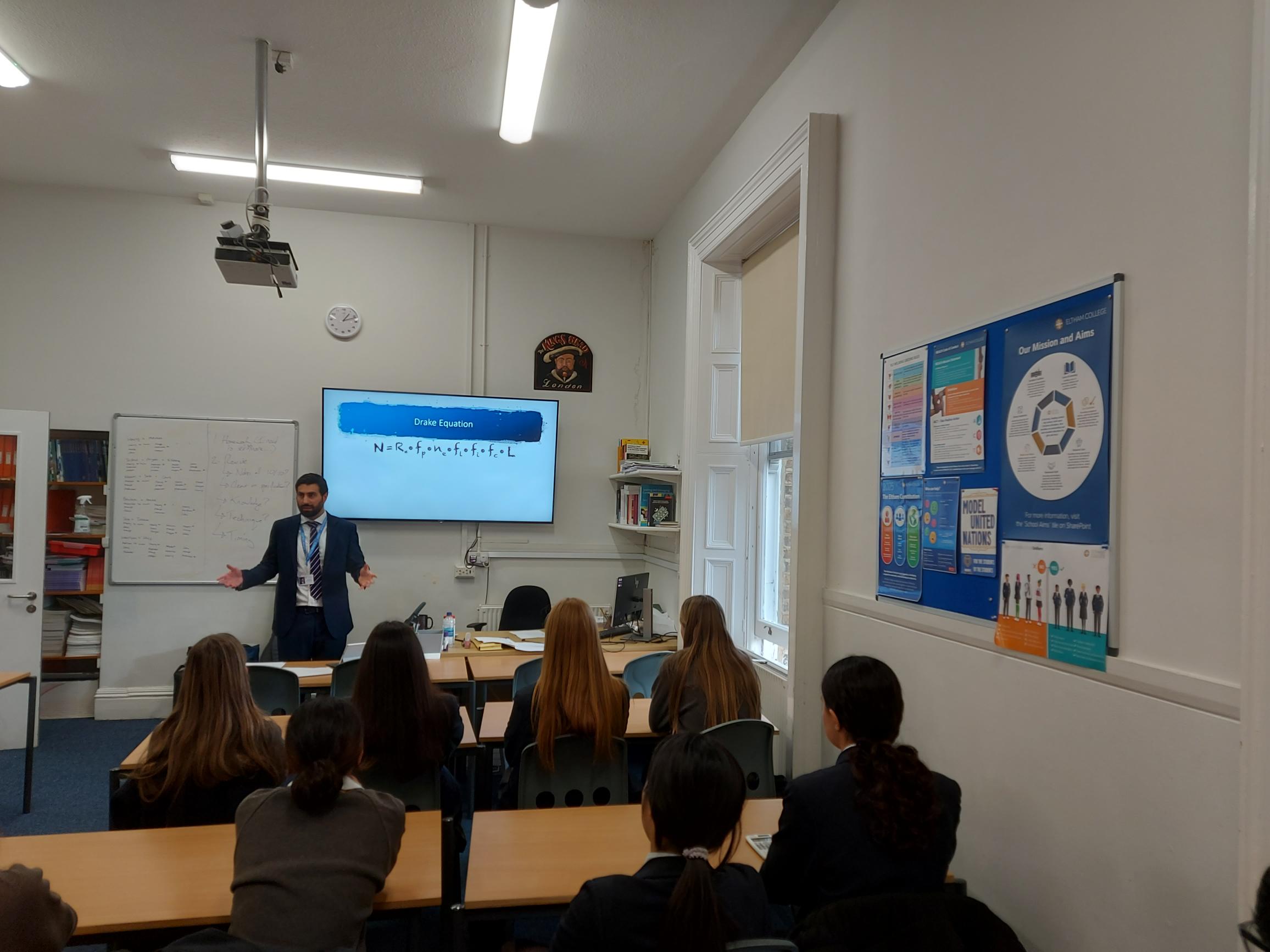 This week’s meeting of the Year 11 Colloquium, led by Mr Hindocha, focused on the question of whether there is intelligent life elsewhere in our galaxy. Having considered a definition of intelligent life, the students were introduced to the famous Drake Equation — a probabilistic argument attempting to determine how many such intelligent, communicative systems there might be.
