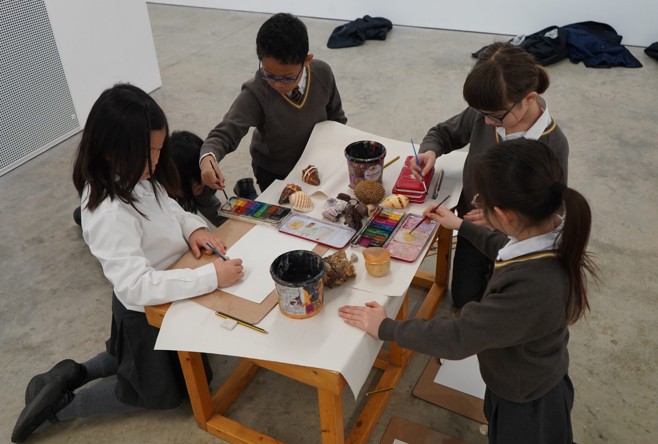 Inspired by the exhibition, the pupils then selected from a variety of natural objects, including shells, seed pods, pine cones, and knots of wood, to create their own still-life arrangements. Guided by gallery staff, they first sketched their compositions in pencil, paying attention to shape, texture, and detail. The activity concluded with the application of watercolour, allowing each pupil to experiment with colour and shading, echoing O’Keeffe’s expressive approach to natural forms.