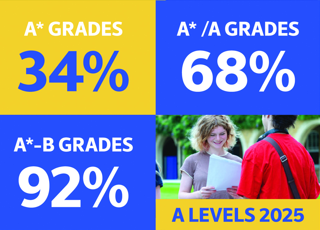 Superb STEM results include an impressive 45% of candidates attaining A* and 82% A*/A in Chemistry, with 40% and 57% gaining A* grades in Maths and Further Maths respectively. As a result, no fewer than five students have secured places to continue their scientific studies at world-leading Imperial College.